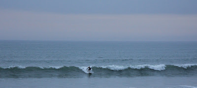 After the masses return to the grind, the sun goes in and the wave height drops. Or at least that's what it felt like today. I was dragged to the city this weekend and had to leave a beautifully clean 2-4 ft wave. When I returned last night I promised myself whatever the wave, I would make it out tonight. As you can see the sky was dark, the rain poured and it all felt a bit lonely. So when I saw this little clique sat on the horizon, they captured my interest. They sat waiting for the set waves and seemed to have something 'not of this world'. After I took the picture, I paddled out and it felt like the wave seemed to double in height, the guys knew just when to paddle, and picked off wave after wave. However when the next set pushed through, and it was my time to paddle, I looked round and they had vanished.